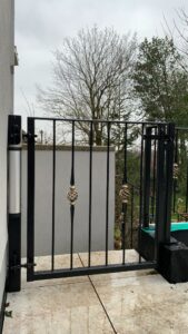 A set of bespoke Gates – with a Hydraulic gate closer, railings, and stairs balustrade were fitted in Llanelli for a valued customer by the Team at Cimla Forge.